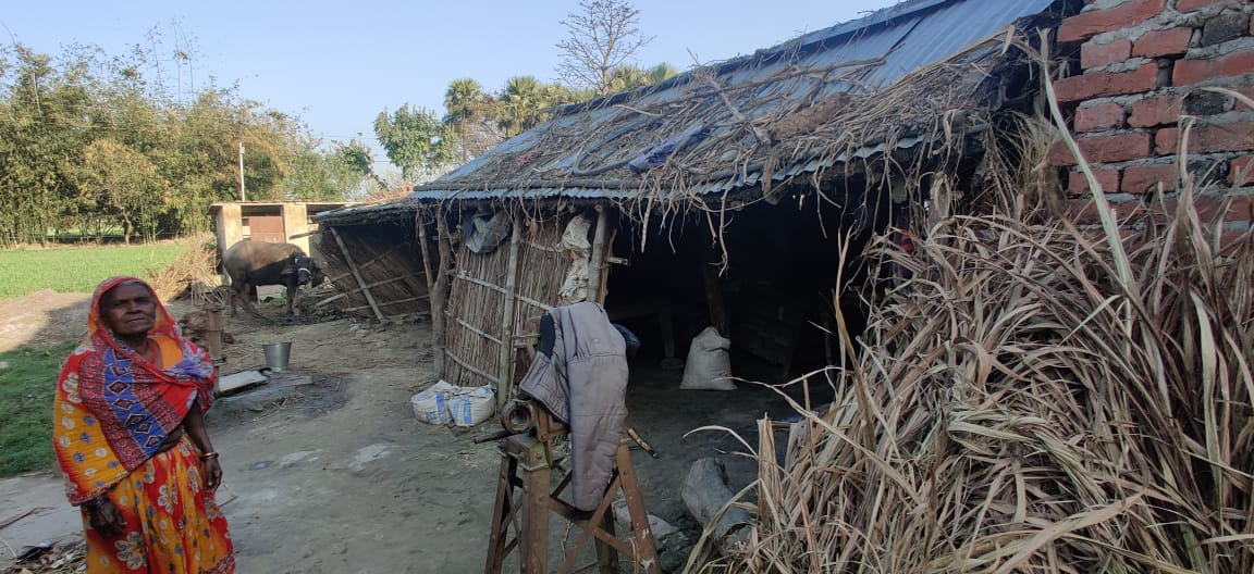 A resident from the Musahar tola in Uttar Pradesh stands by her kuchha home. Photo: Ajoy Ashirwad Mahaprashasta/ The Wire.