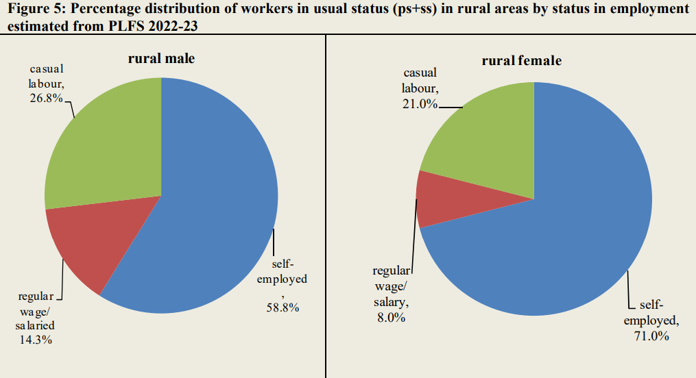 The PLFS divides employment status for workers into three broad categories: (i) self-employed, (ii) regular wage or salaried employees, and (iii) casual labour.