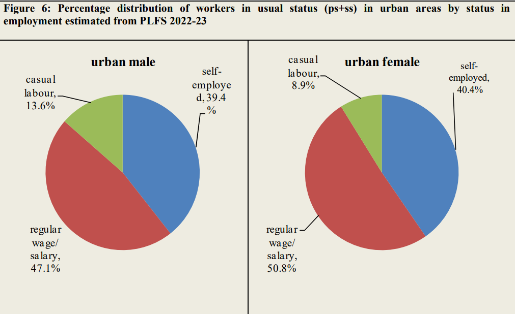 According to the PLFS data, a larger number of individuals are self-employed than those in casual labour and the regular salaried class.