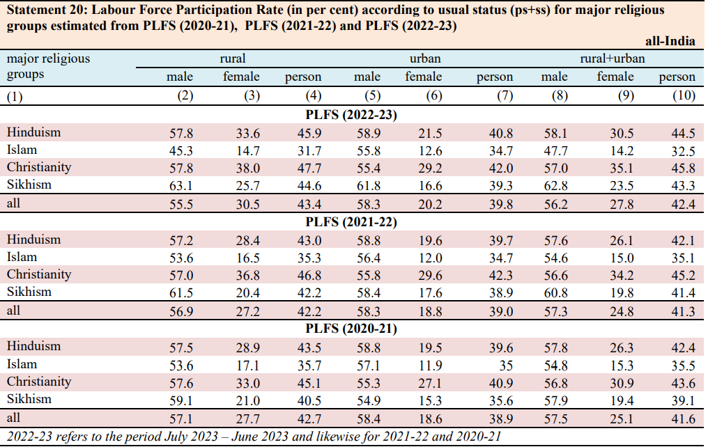 Moreover, the data highlights that, among the major religious groups, only Muslims have experienced a decline in their labour force participation rate (LFPR) and worker population ratio (WPR).