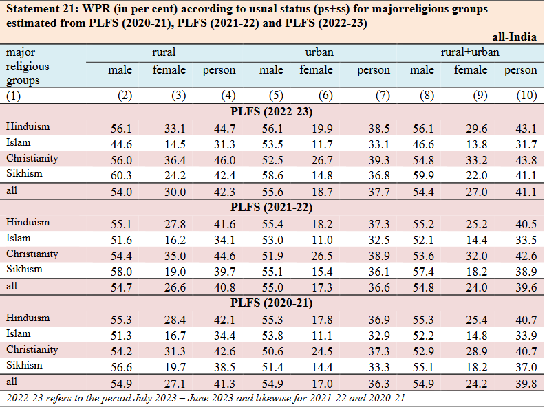 Similarly, the WPR for Muslims stood at 33.9% in 2020-21 and 33.5% in 2021-22. It declined to 32.5%.