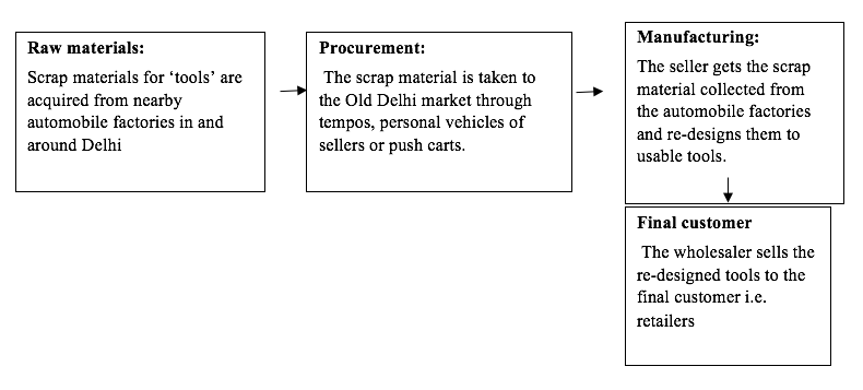 Most vendors interviewed in Meena Bazaar set up their shops when they shifted to the city in the 1970s and still have unregistered stalls running entirely on a cash-based business model. Below is a supply chain matrix on the inventory management of scrap tools and second hand machinery products sold near the Jama Masjid area of Motor Market.