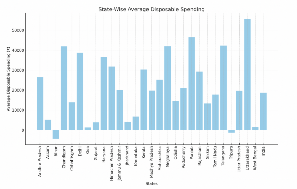 India’s states demonstrate stark contrasts in household spending and disposable income. States like Kerala, and Andhra Pradesh lead with higher average disposable incomes, while states such as Bihar, Assam, and Chhattisgarh lag significantly behind.