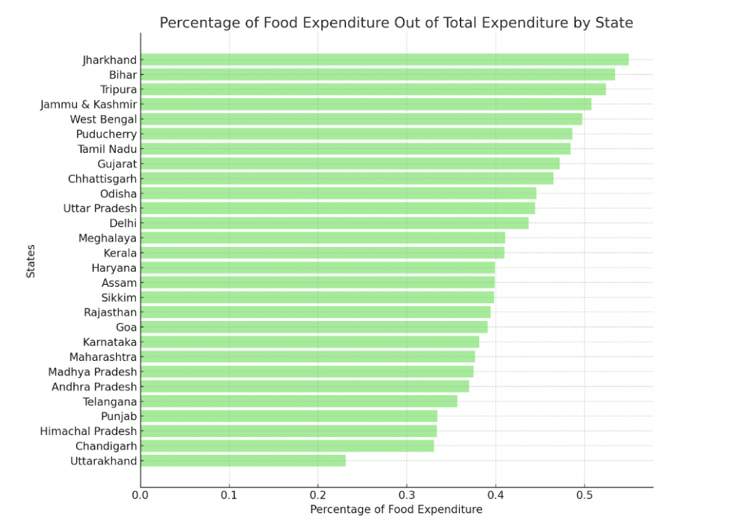 In states like Bihar, Odisha, and Chhattisgarh, more than 50% of household budgets are directed toward food expenditures. This is in stark contrast to wealthier states like Chandigarh and Tamil Nadu, where food accounts for only around 30% of household spending.
