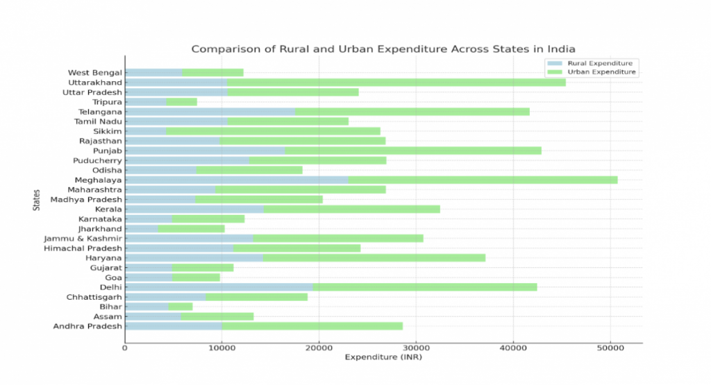 In states like Bihar and Assam, lower wages and dependence on subsistence farming make rural populations particularly vulnerable to economic shocks like food inflation. For example, in Bihar, the monthly expenditure of rural households is significantly higher than that of urban households, reflecting the region's high cost of living and limited access to markets.