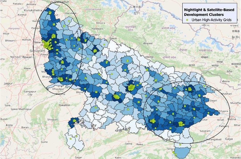 The proof of concept developed for Uttar Pradesh shows how this works in practice [see Note below]. The state was divided into small geographic grids of approximately two and a half kilometres each. All the grid cells were enriched with night-time light intensity and population density. A convolutional neural network then identified patterns in the satellite images and an algorithm grouped similar areas together without pre-defined categories. Different types of development – dense urban corridors, semi-urban zones and sparsely developed areas were thus identified.