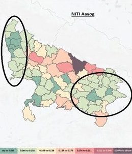 In Map 2, the encircled region corresponds to a bright and dense corridor in the satellite output seen in Map 1, as well as to lower MPI in the published district-level reports. This is early but promising evidence that development patterns inferred from satellite data can meaningfully track welfare indicators, despite being generated without a dedicated survey.