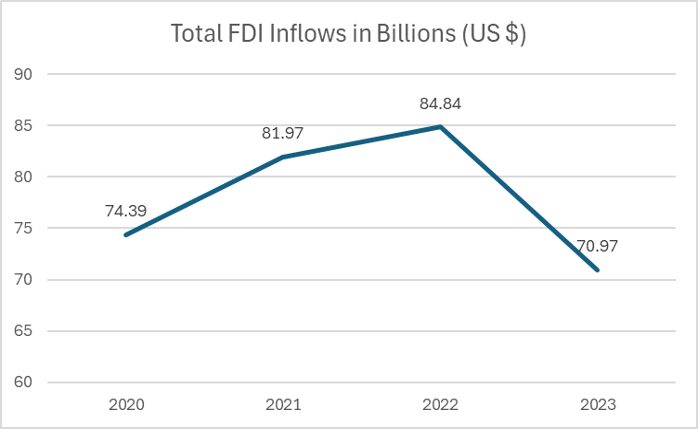 The Modi government has consistently exceeded its budgeted Capex targets in recent years. In FY22-23, the government expended Rs 7.36 lakh crore compared to the revised estimate of Rs 7.28 lakh crore. And for FY24, it has already crossed the 50% mark of the Rs 10 lakh crore that was announced in the budget. On FDI, the total foreign direct investment inflow into India dropped to $70.9 billion in the financial year 2023. There was a 16% decline from last year.