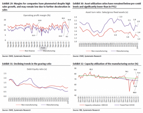 The charts below reflect the full story in data. Margins for companies have plummeted despite high sales growth, and may remain low due to further deceleration in sales. Asset utilisation rations have remained below pre-covid levels and significantly lower than in FY12.