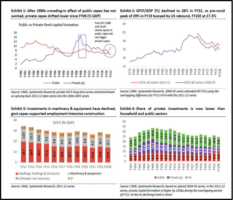 There was a time up until when a higher supply side fiscal push that enabled more jobs and labour-intensive manufacturing helped the government ensure more growth and jobs. As per infographics sourced from a brief by SIE (Systematix Institutional Equities) below, observe how the effect of government expenditure on capital intensive projects was exceedingly positive till the decades of 1980s-1990s but post the financial crisis in 2008, greater government spending did not attract expected private capital Investment, which has been seen after the COVID-19 crisis as well.
