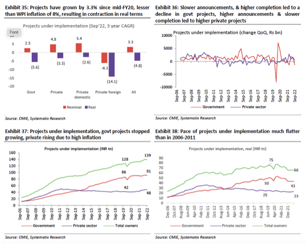 Moreover, as the charts below show, many public and private projects under implementation have contracted over time due to several factors. Pace of projects (public and private) under implementation has been much flatter than, as seen in the 2006-2011 period.