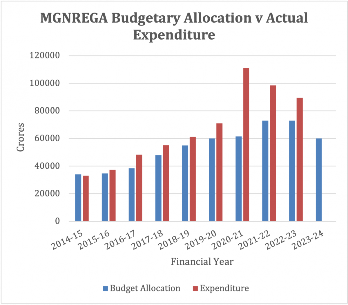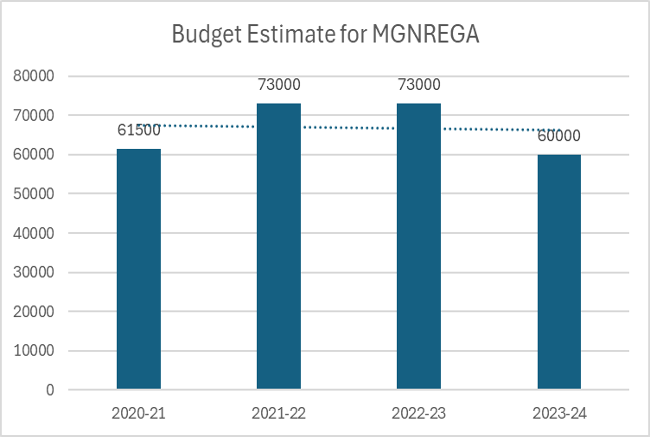 The most significant reduction in the Union government’s own social spending was observed in the budgeted allocation for the Mahatma Gandhi National Rural Employment Guarantee Act (MGNREGA) scheme, seen below.