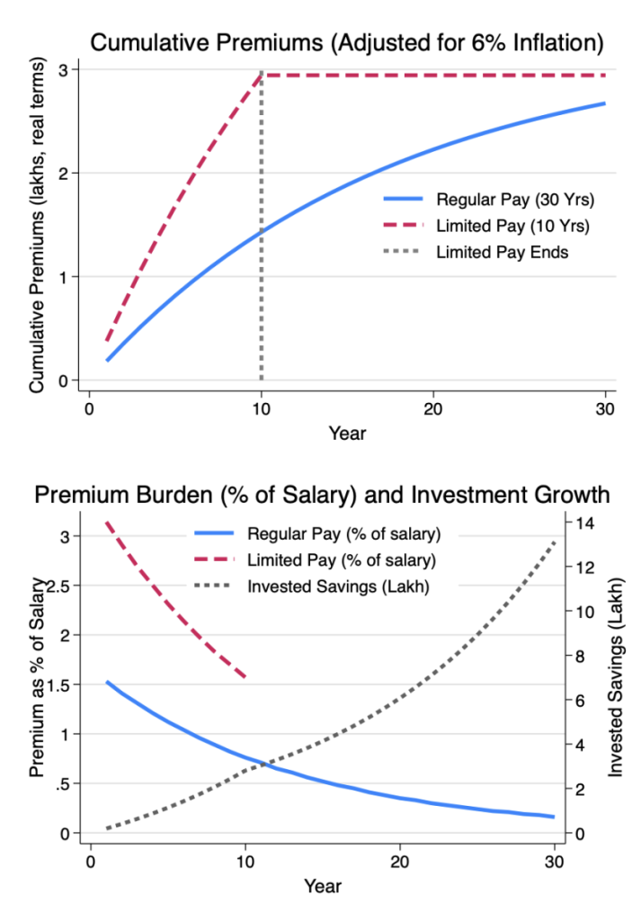 Income growth also matters. For someone earning Rs 1 lakh per month with average annual increments of 8%, the regular pay premium falls from about 1.5% of income in the first year to less than 0.2 % by year 30. Limited pay, in contrast, absorbs more than 3% of income during the initial decade, when expenses on housing, childcare, and other obligations are typically highest.