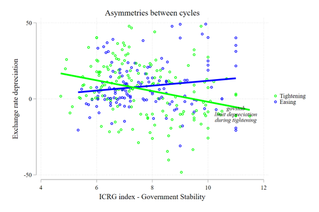 The analysis highlights key asymmetries in how government stability impacts emerging markets during tightening and easing cycles. During US monetary tightening, countries with higher government stability experience less currency depreciation, as shown by the green line in Figure 2. This suggests that stable governments help maintain investor confidence, mitigating the negative effects of rising interest rates and capital outflows.