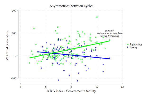 Similarly, the impact of government stability on stock market performance also shows asymmetries between tightening and easing cycles. During US monetary tightening, better government stability correlates with stronger stock market performance, as shown in Figure 3. This suggests that stable governments help sustain investor confidence and market stability during periods of financial stress.