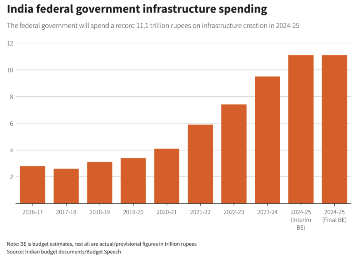 The government retained an all-time high infrastructure spending target of Rs 11.11 trillion in the fiscal year 2024-25, accounting for 3.4% of the GDP.