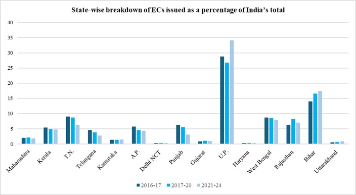 The table below shows the state-wise breakup of Emigration Clearances (ECs) issued to blue-collar workers for employment in the Gulf. There is a sharp decline in the southern states, while the northern states now constitute a significant share of workers, with Uttar Pradesh and Bihar leading. This trend is likely to accelerate as southern states undergo demographic transitions that reduce their out-migration potential.