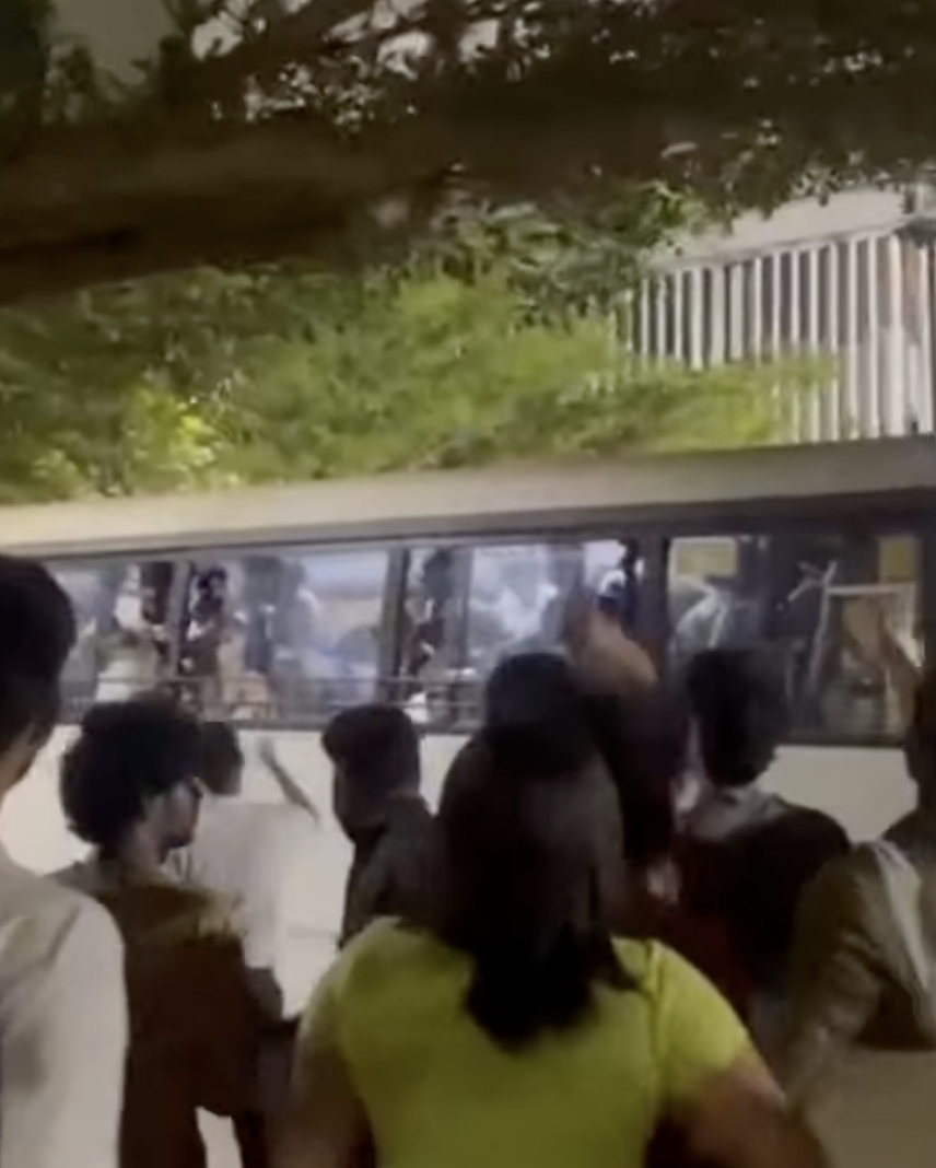 In a video circulating on social media, ABVP members are seen throwing slippers at the students from inside a bus as the police take them away.