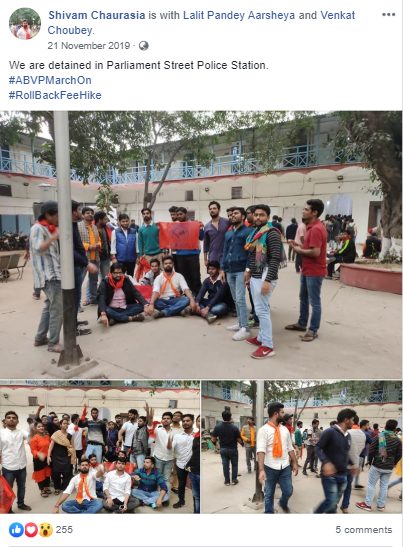 The above image was posted by one Shivam Chaurasia on November 21, 2019. “We are detained in Parliament Street Police Station.#ABVPMarchOn #RollBackFeeHike”, reads the accompanying message.