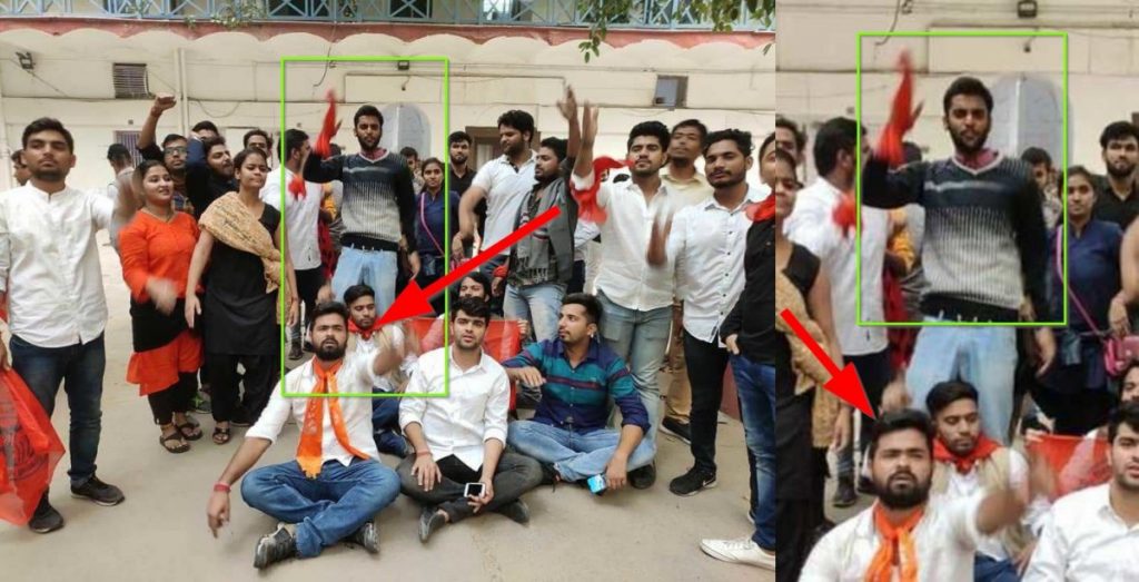 In several images posted by ABVP members (Ayush Kasana, Nishul Khrub), Awasthi is seen walking with a group wearing saffron scarves.