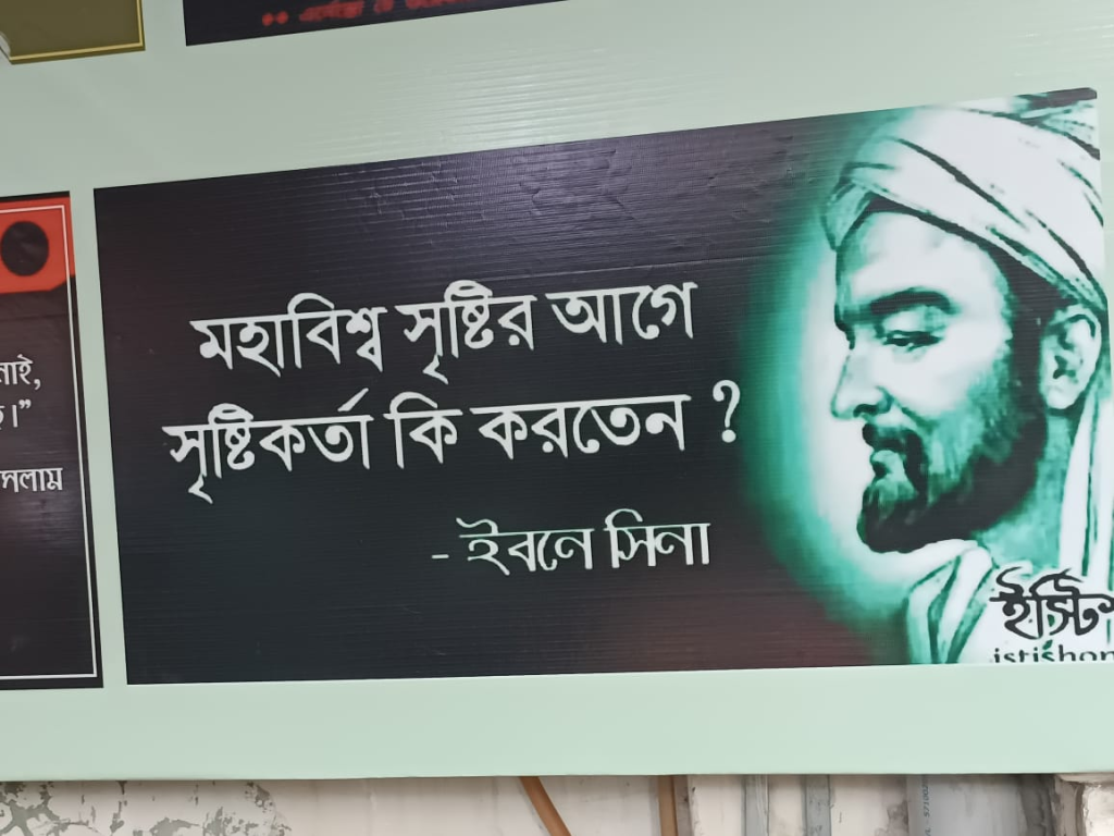 A poster at the Atheist Forum's conference, quoting Ibn Sina saying, 'What did the creator do before creating the universe?'. Photo: Joydeep Sarkar/The Wire.