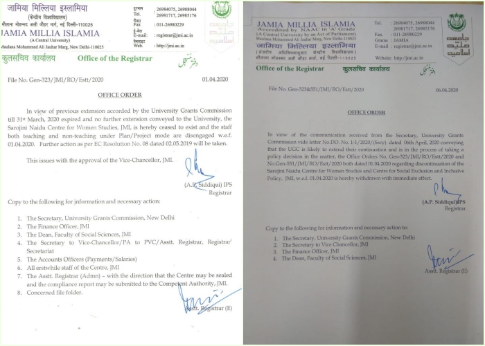 The letter discontinuing the women’s studies department read, “In view of the previous extension accorded by the University Grants Commission till March 31, 2020, expired and no further extension conveyed to the university, the Sarojini Naidu Centre for Women’s Studies, JMI, is hereby ceased to exist. (sic)”