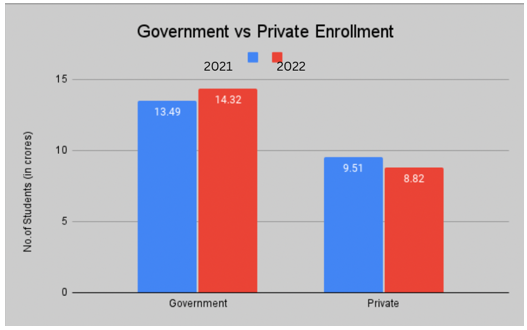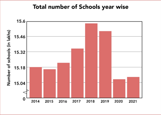 Additionally, the number of schools declined from 15.09 lakh in 2020-21 to 14.89 lakh in 2021-22. This trend may not necessarily indicate a negative standard of education.
