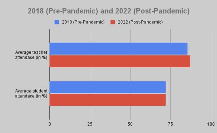 For both students and teachers, attendance in school has stayed more or less the same since 2018. Average teacher attendance increased from 85.4% in 2018 to 87.1% in 2022. Meanwhile, average student attendance continues to hover at around 72% for the past several years.