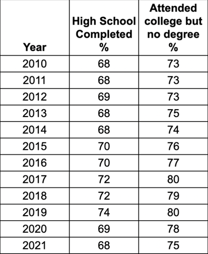 The National Center for Educational Statistics found that those who started their careers directly out of high school and whose parents lacked advanced degrees were more likely to believe that a college education was not required to achieve their professional objectives. It may be possible that with time, more people began to believe that jobs can be secured without a good degree or completion of education (as employment went up for them till 2019 as seen in the table below).