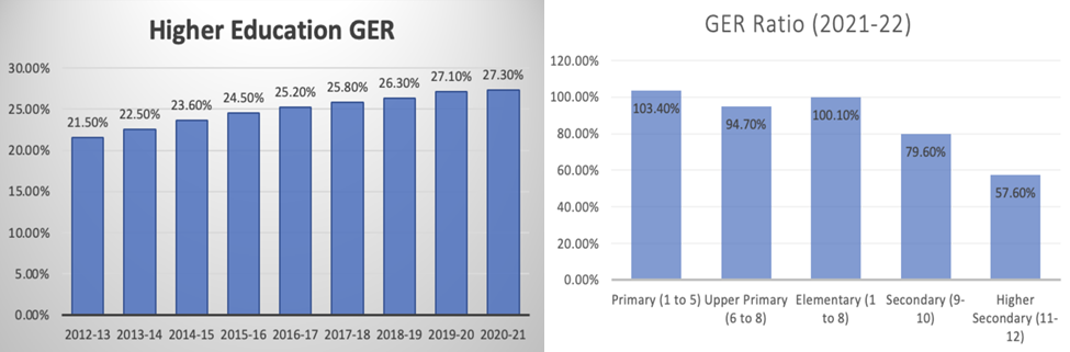 The gross enrollment ratio (GER) is the ratio between the number of pupils enrolled at a certain educational level (such as elementary schools or higher education) and the number of children who would typically attend that level of instruction. We see that although India's higher education GER is improving each year, it is far less than what is needed for India to achieve its $5 trillion economy dream.