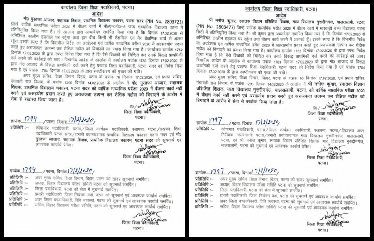 Under orders to take disciplinary action, Patna district education officer Jyoti Kumar on February 17 dismissed two teachers with immediate effect. He said they were not performing their designated duty and causing indiscipline. Manoj Kumar of Nasseruddin Middle School, Patna and Md Mustafa Azad of Chakaram Primary School were dismissed from service.