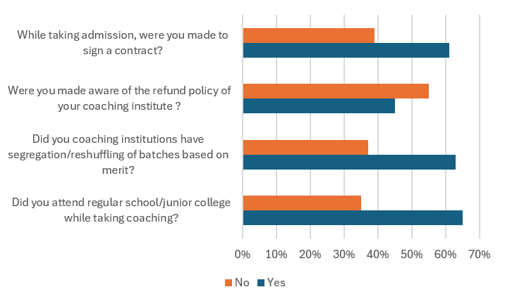 Coaching institutions refuse to refund fees, as evident from numerous cases filed in consumer courts. Further, students are not made aware of the refund policies of coaching institutions while joining the same. Almost half of the engineering students and 60 per cent of law students claim that they were not made aware of the refund policy of their institute.