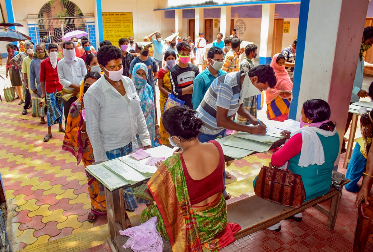 Guardians of students stand in queues to collect mid-day meal at a school during a nationwide lockdown imposed to curb the spread of novel coronavirus, in Murshidabad district, Monday, April 20, 2020. Photo: PTI