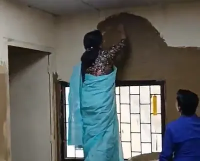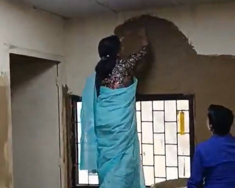 In the images and videos circulated on the group, Vatsala is seen standing on a chair, applying cow dung to the walls of a room in C Block. The college staff is seen assisting the principal.