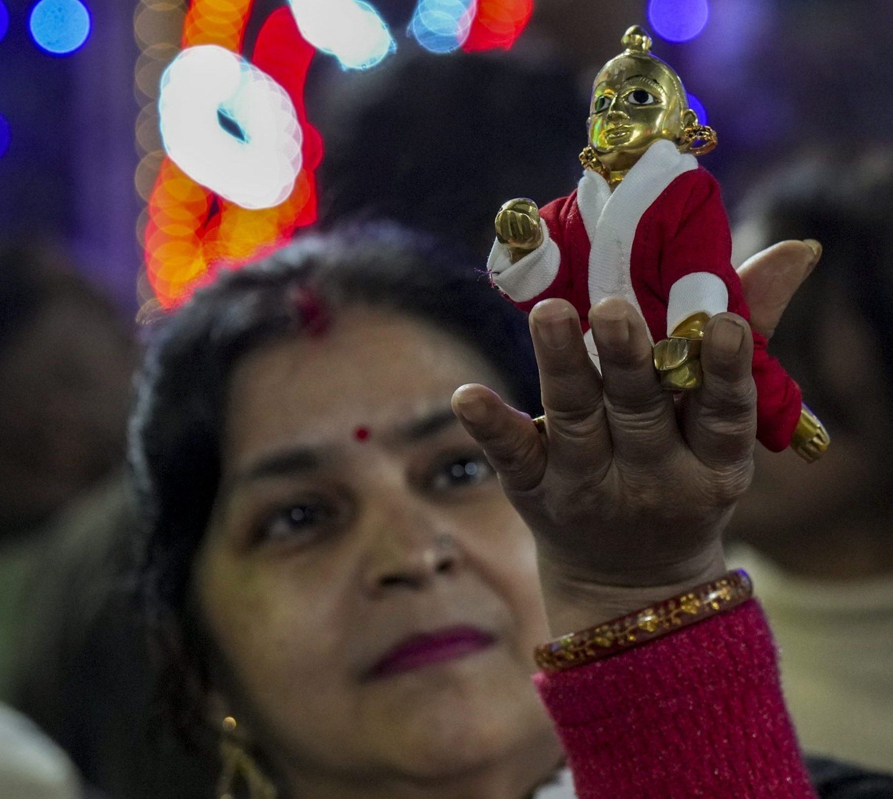 Changing beliefs? A woman holds a miniature idol of Lord Krishna as a child, dressed as Santa Claus. Kolkata, December 2025. Photo: Manvendra Vashisht/PTI