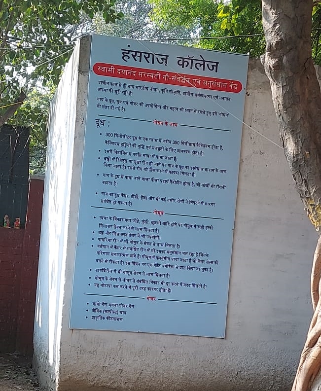 As one enters the traditional red-brick Delhi University college, one will notice a freshly-painted red wall located by the college gate for the men’s hostel. The wall has a white board on it which says ‘Hansraj College’. Normal, so far – but below that sits a photo of a cow, with the label ‘Swami Dayanand Saraswati Gau-Samwardhan Ewam Anusandhan Kendra’.