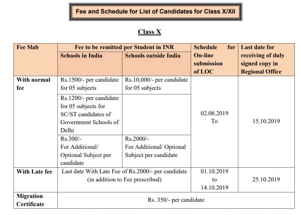 | Class 10 | Schools in India | General | Rs 125/250@ | Rs 750 | Rs 1500 | Rs 1500 |