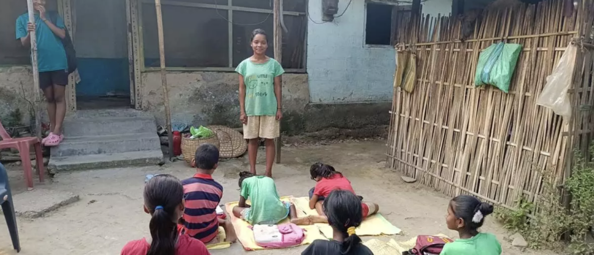 Rinku Bawri, 21, from Assam's Koilamari tea estate teaches Adivasi children free of cost at the tiny courtyard of her house. She fears that otherwise, these children will drop out of school. Photo: Maitreyee Boruah