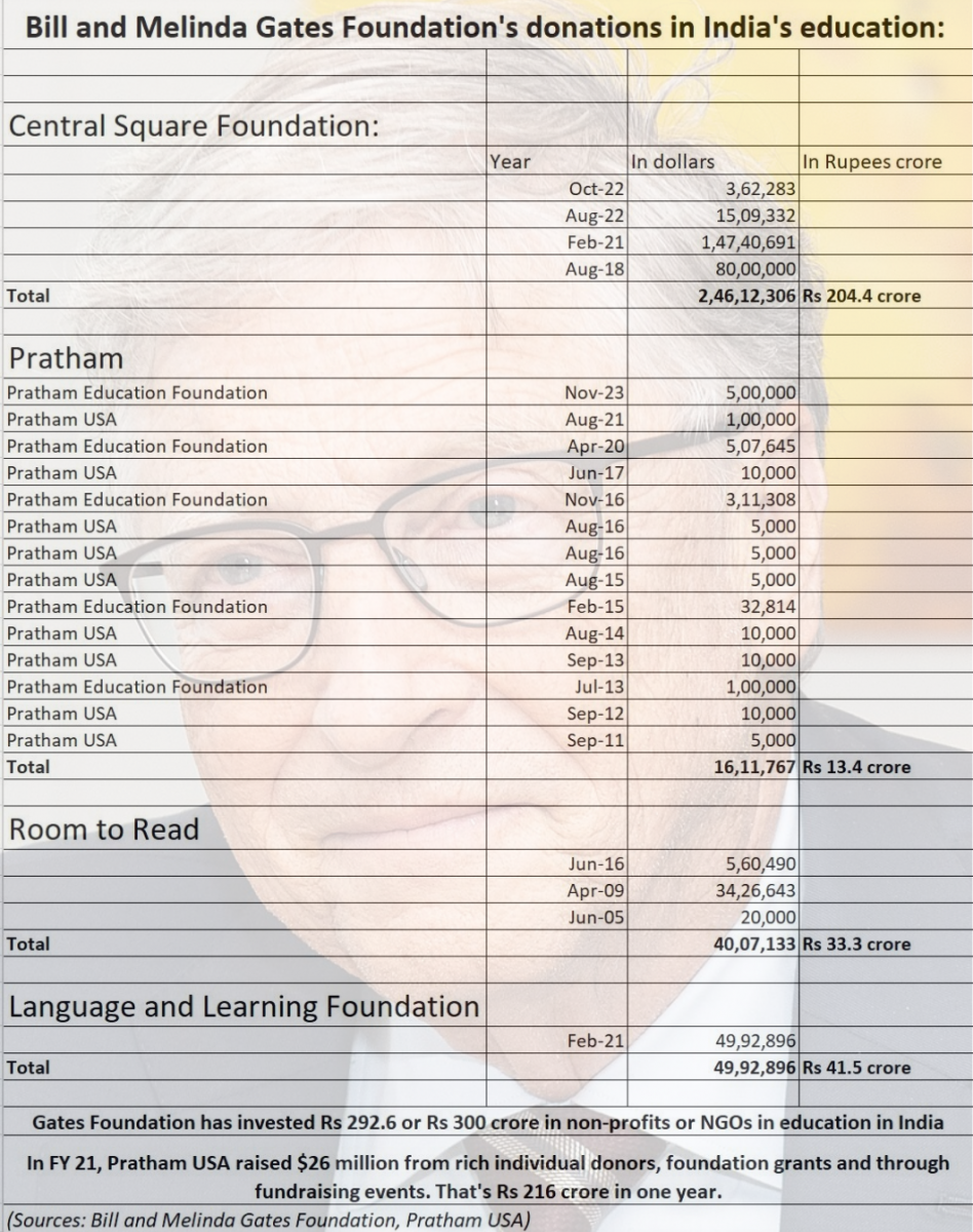 Not to be outdone, the Bill and Melinda Gates Foundation pours in Rs 300 crore into education in India since 2009. The donations are made through various NGOs, notably Central Square Foundation (led by Ashish Dhawan, who is also one of the founders of Ashoka University), Pratham (led by Madhav Chavan and Rukmini Banerji), Room to Read, and Language and Learning Foundation (led by former bureaucrat Dhir Jhingran).