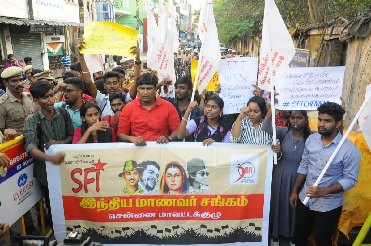 Student Federation of India (SFI) protest outside IIT-Madras in Chennai over a student's suicide. Photo: Special arrangement.