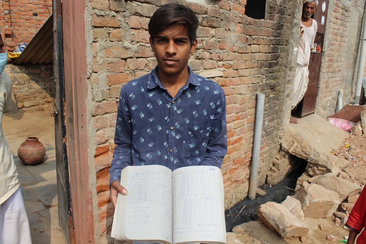 Dhanraj holding up his tuition notes. Post the lockdown, he has been managing his family shop. Photo: Shruti Jain