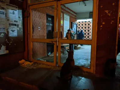 The front door of Sabarmati hostel, made of glass windows, has been smashed. Inside too, broken glass and furniture can be seen. Cars parked outside have also had their windows smashed.
