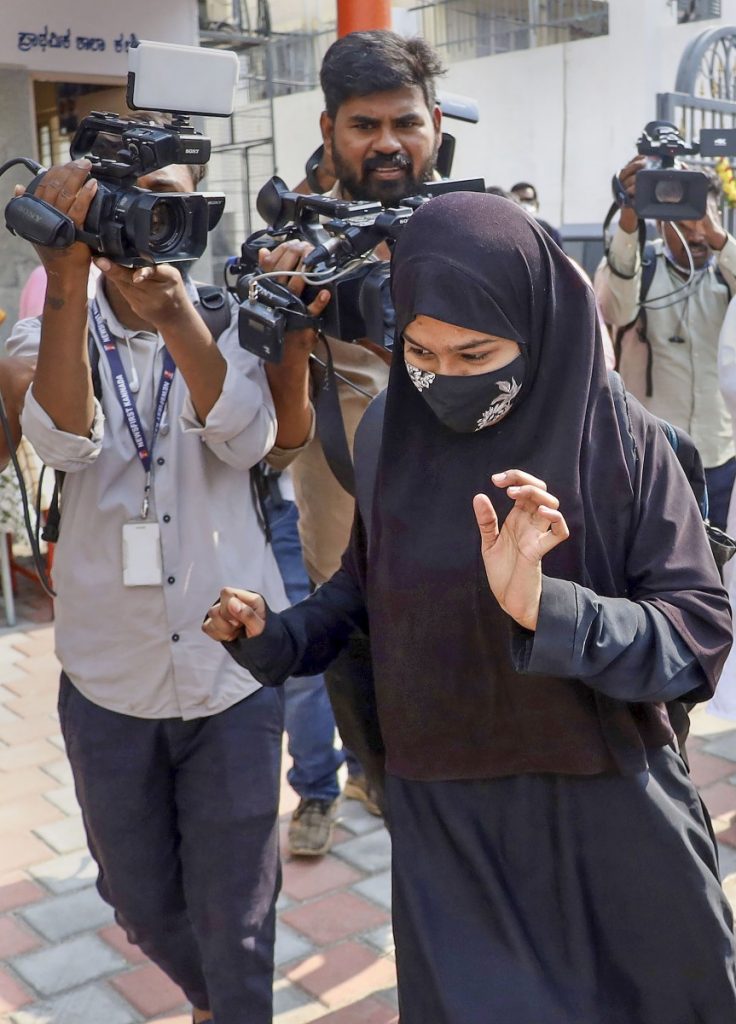 A student has cameras thrust in her face as she arrives for her SSLC exam at a centre in Bengaluru wearing a hijab on March 28. Photo: PTI.