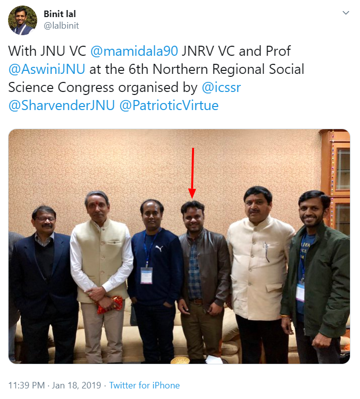 In the photograph below, Sharvender (who has now deleted/deactivated his Twitter account), can be seen alongside JNU VC Mamidala Jagadesh Kumar and the dean of School of International Studies (SIS), JNU, Ashwini Mohapatra.