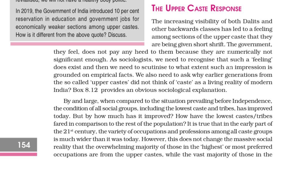 Interestingly, it is not just the mention of caste atrocities and cases of discrimination that is being dropped from the text. A section in the textbook dispassionately engages with the upper caste anxieties around caste. “The increasing visibility of both Dalits and other backward classes have led to a feeling among sections of the upper caste that they are being given short shrift,” the section begins. “As sociologists, we need to recognise that such a ‘feeling’ does exist, and then we need to scrutinise to what extent such an impression is grounded on empirical facts. We also need to ask why earlier generations from the so-called ‘upper castes’ did not think of ‘caste’ as a living reality of modern India?” the chapter further explains.