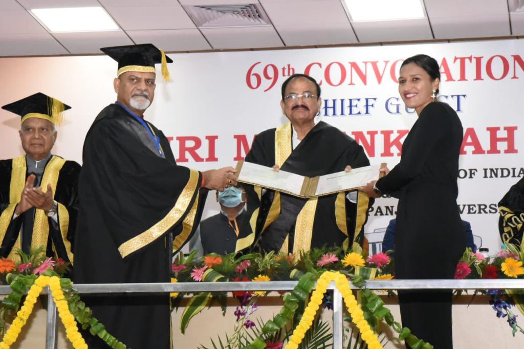 Professor Raj Kumar with former VP Venkaiah Naidu and hockey player Rani Rampal at a Panjab University function. Photo: Twitter/@imranirampal