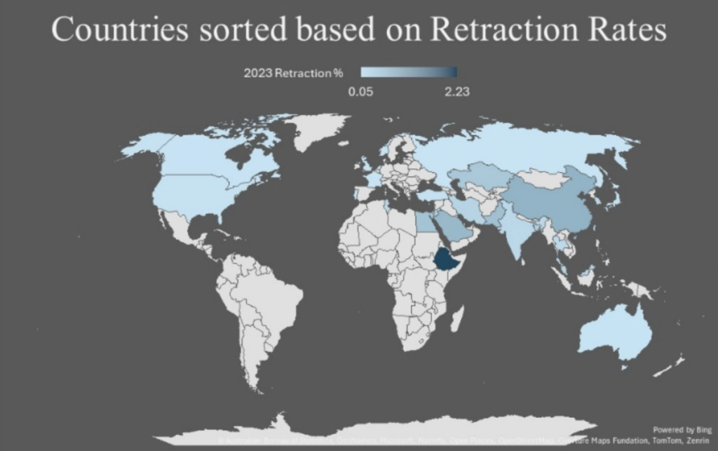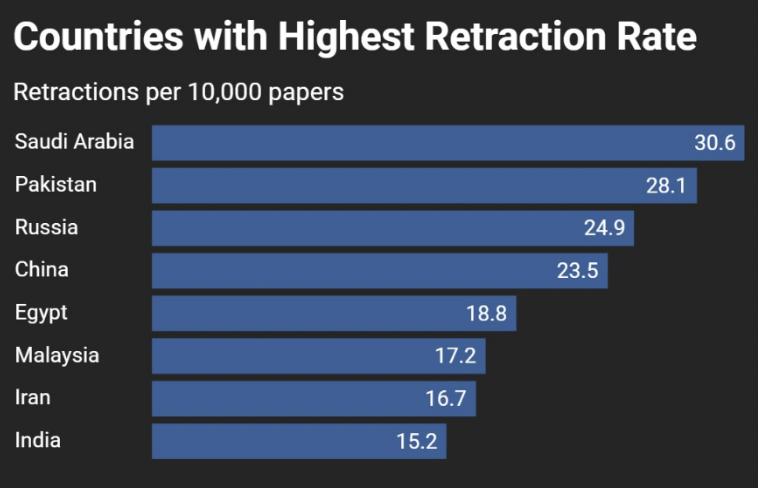 A closer examination of the data reveals a geographic clustering of high retraction countries mainly in Asia, West Asia and Eastern Africa. China, India, Pakistan, Saudi Arabia, Egypt, and Iran are the nations where publication numbers have skyrocketed while retractions have caught up at a frightening rate.