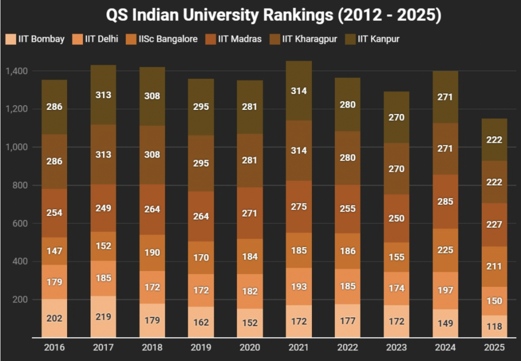 This gets reflected when we critically analyse India's rise in the QS Subject Rankings particularly in STEM fields like engineering, computer science, materials science, and medicine coincides with QS’s increased emphasis on research citations per paper and international research collaboration. These indicators have allowed institutions like the Indian Institutes of Technology (IITs), Indian Institute of Science (IISc), and even emerging private universities to climb in rank, given their focused efforts on improving citation metrics and international co-authorship.