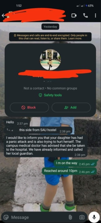 South Asian University hostel’s caretaker allegedly under the instructions from warden and dean of students sent a WhatsApp message to the student’s guardian. Photo by arrangement