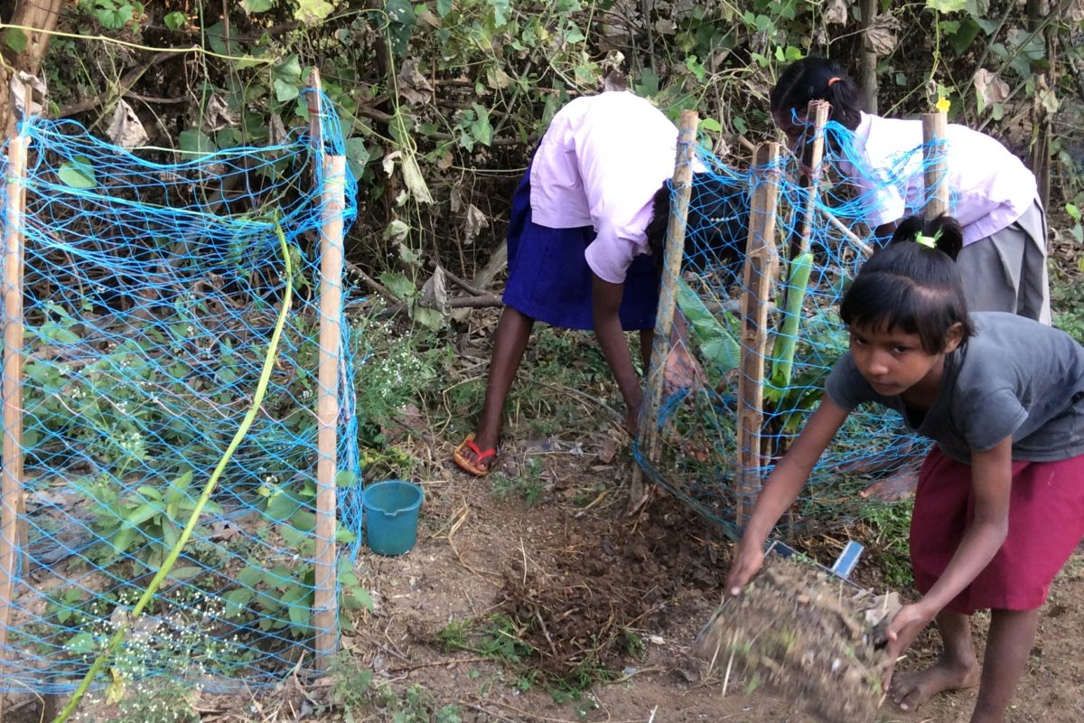 A hum of voices reciting “A for aluminium” and “B for boron” float through the air in a room of eager children. As the clock strikes three in the afternoon, a few older children, clutching books and notebooks, trickle into Pradhan Birua’s courtyard with hens clucking and pecking grains. In the backyard, gardening activities touch a feverish pitch. While some girls scoop dirty soil with shovels and place it in a large flower pot, others tie a blue nylon net around four bamboo poles encasing a tender banana plant.